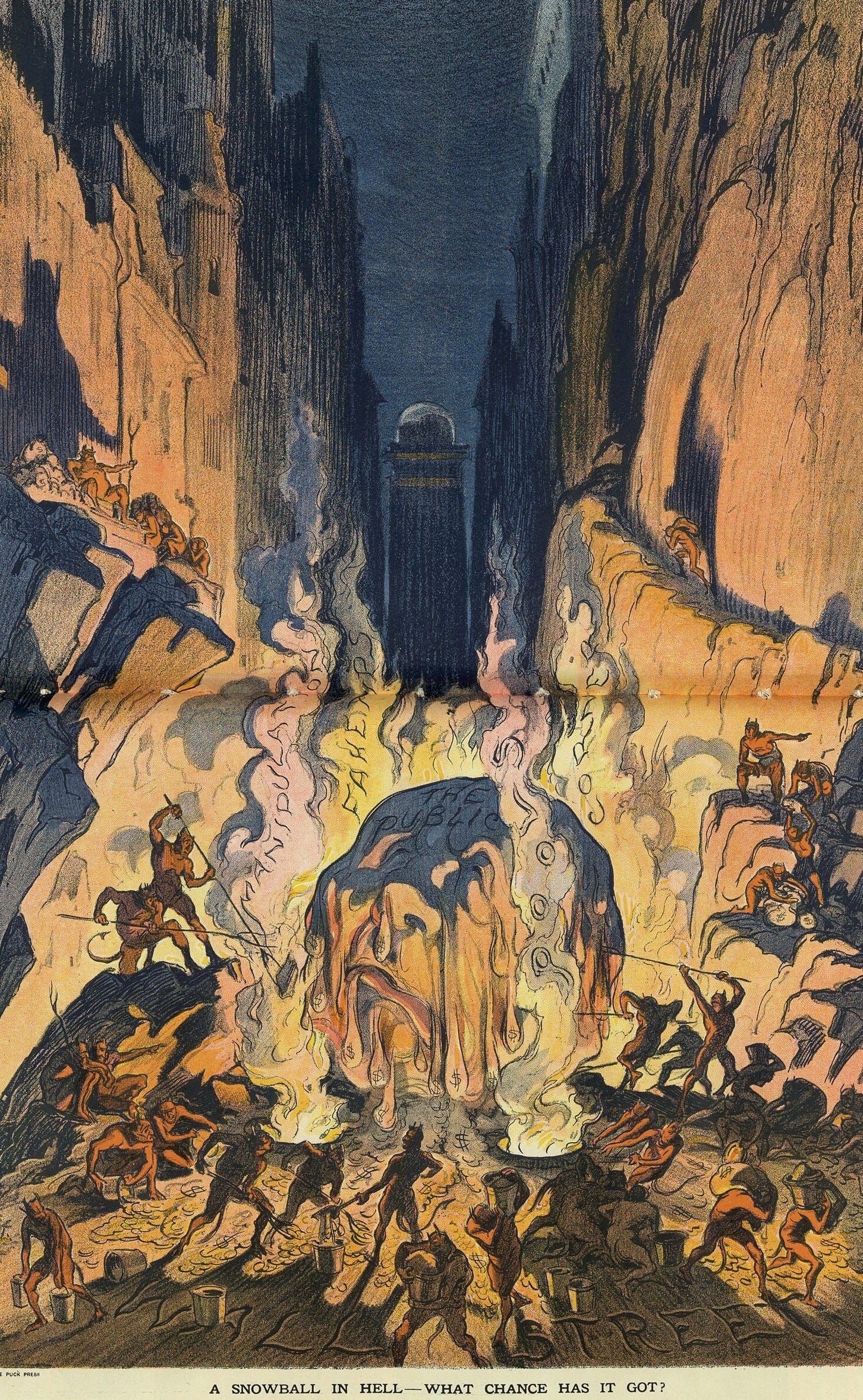 An illustration from Puck Magazine entitled “A Snowball in Hell - What Chance Has It Got?” depicting a large face-shaped snowball labeled “The Public,” dripping money as it melts, while devils carry off the cash and coins to Wall Street.