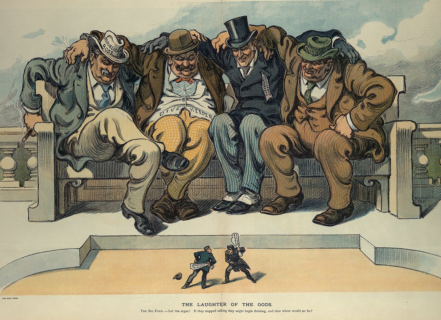 An illustration from Puck Magazine entitled “The Laughter of the Gods” depicting two small figures arguing over ‘democratic’ and ‘republican’ principles as four large figures look down on them in amusement: a Republican Boss, a Dive Keeper, Privileged Interests, and a Democratic Boss.